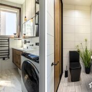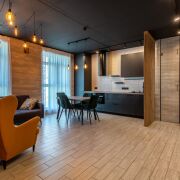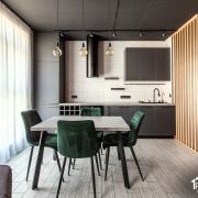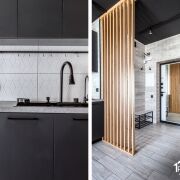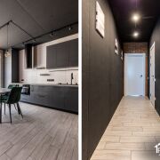 ► Цветовая гамма — гармоничная: серый, белый, древесный, чёрные акценты