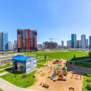 ○ Через дорогу — парк с фонтанами, зонами отдыха и спорта