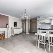- В отделке использованы только премиальные материалы. Установлены итальянские двери с литой латунной фурнитурой и надёжным замком Union. Стены оформлены текстильными обоями итальянского производства, а пол и стены в ванной отделаны итальянской плиткой. Санфаянс бренда Jacob Delafon подчеркивает уровень качества. В душе установлена система тропического дождя. Освещение продумано до мелочей. Чешские люстры с 24-каратным золочением наполняют комнаты мягким светом. Выключатели и розетки эксклюзивные, итальянского производства.