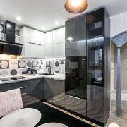 - Кухня оборудована всей необходимой бытовой техникой. Несколько режимов освещения позволяют менять атмосферу для семейных или романтических ужинов, а бар-сервант с подсветкой добавляет выразительности и функциональности.