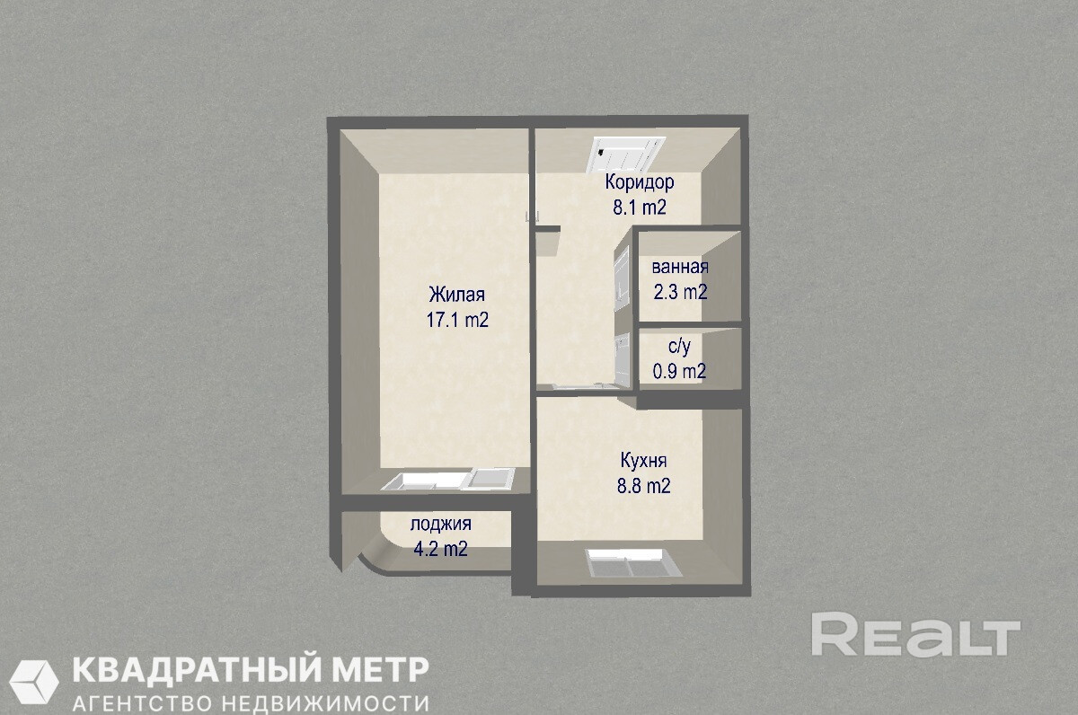 1. Отличная планировка: общая площадь по СНБ – 39,9 м2, жилая площадь 17,1 м2, кухня 8,8 м2., большая не застекленная лоджия - 4,2 м2