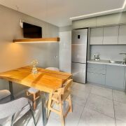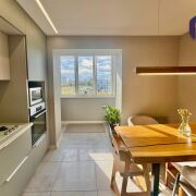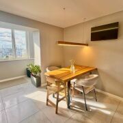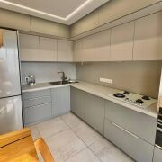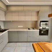 - Кухня является настоящей гордостью квартиры. Здесь тёплый пол, полностью новая мебель и встроенная техника: посудомоечная и стирально-сушильная машины, духовой шкаф с пиролизом, микроволновая печь и телевизор. Обеденный стол и лампа изготовлены из натурального дуба, стулья установлены на металлическом каркасе. Лоджия объединена с кухней и оборудована столиком и комодом, что делает её отличным местом для утреннего кофе.