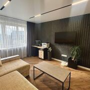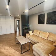 - В квартире общей площадью 82,1 кв. м., с жилой площадью 49 кв. м. и кухней 11,3 кв. м. выполнен современный евроремонт из качественных материалов. Сделана новая стяжка пола, установлена надёжная электрика и мастер-выключатель, уложен износостойкий ламинат.