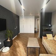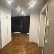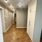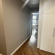 - Большая проходная гостиная спроектирована с учётом хранения и комфорта. Установлены два вместительных шкафа: обувной со встроенными розетками для сушки обуви и шкаф для верхней одежды. Предусмотрен вывод под кондиционер и установлена стильная дверь скрытого монтажа, ведущая в детскую комнату.
