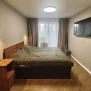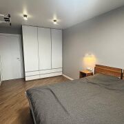 - Спальня радует тишиной и уютом. Одна из стен имеет дополнительную звукоизоляцию, защищающую от соседей, а из окна открывается живописный вид на закат. В комнате установлена двуспальная кровать, большой шкаф и выделена отдельная гардеробная зона.