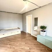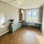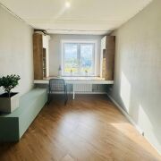 - Детская комната светлая и функциональная. У окна расположен рабочий стол на два места, тахта с выдвижными ящиками и удобная полка для вещей. Потолок пока не завершён: оставлено место для установки двухъярусной кровати, что позволит новому владельцу оформить пространство по своему вкусу.