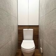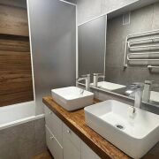 - Раздельный санузел оформлен со вкусом. Дубовая столешница и два накладных умывальника создают стильный и функциональный интерьер.