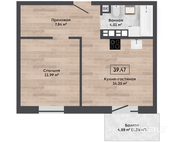 - Формат: евродвушка - просторная кухня-гостиная + комната;