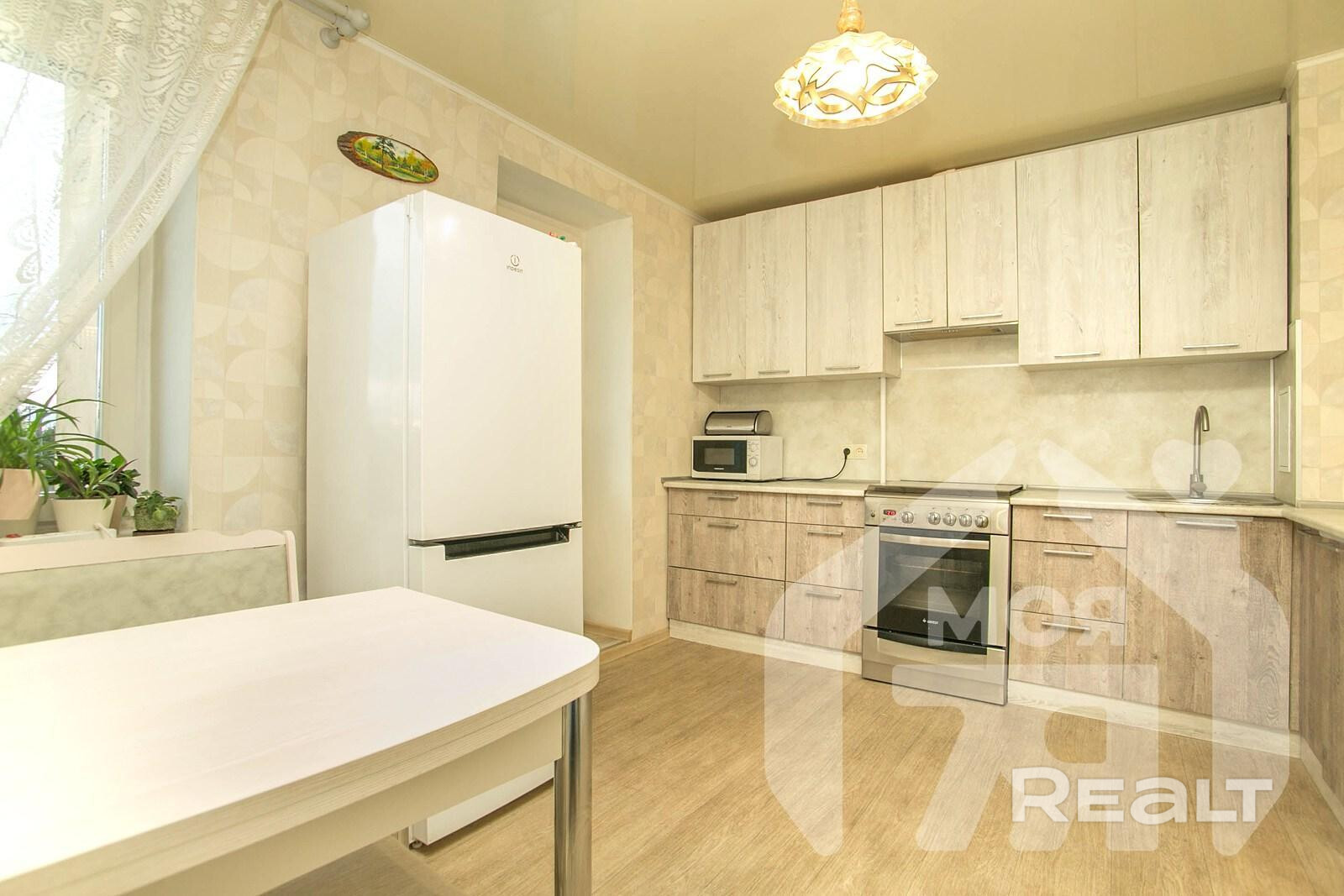 - Выполнен аккуратный косметический ремонт: на полу уложен ламинат, санузлы облицованы плиткой. На кухне сделан свежий ремонт и установлена новая мебель, окна - деревянные стеклопакеты.