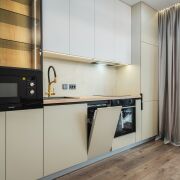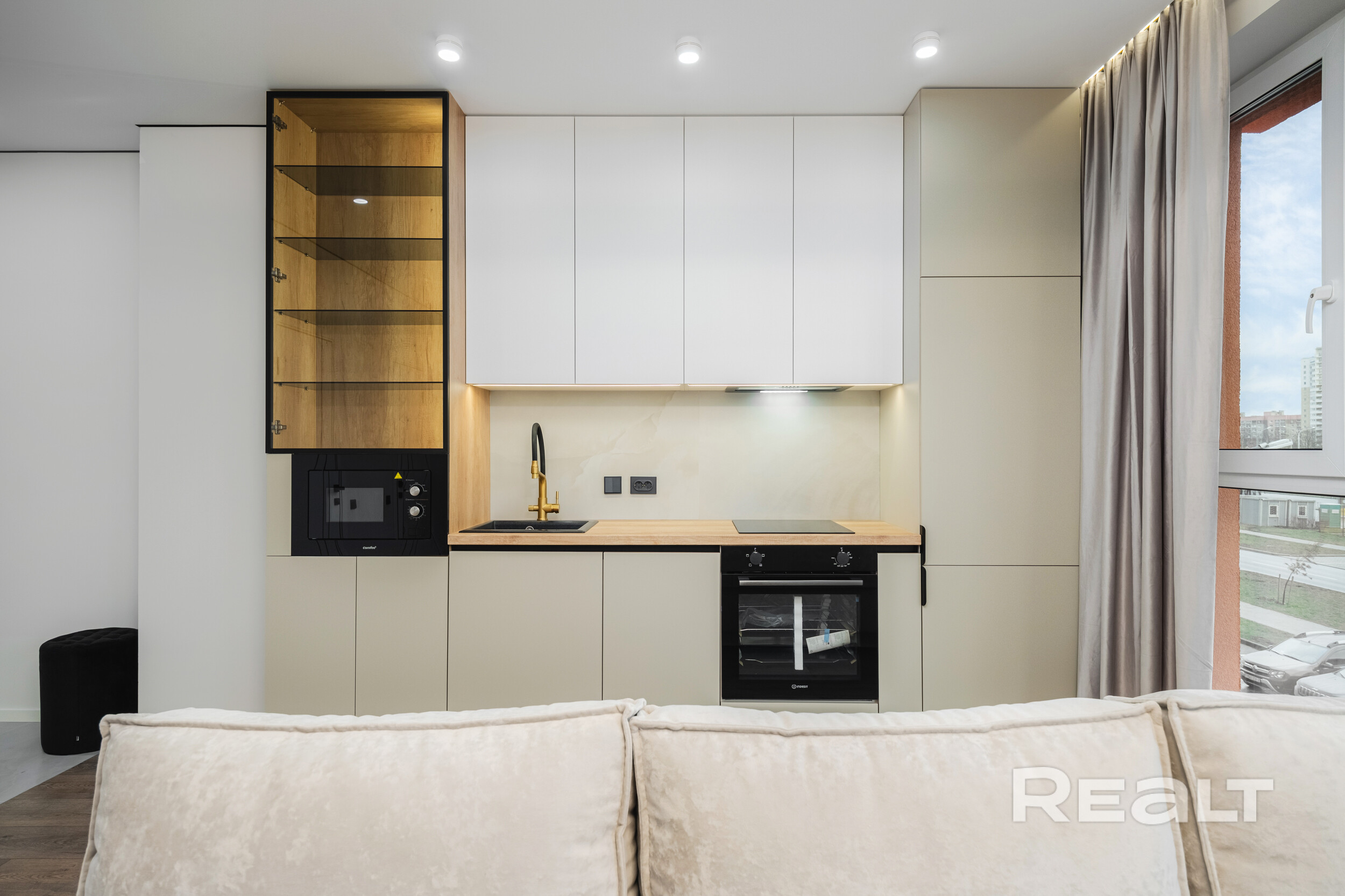- Яркая кухня-гостиная со встроенной техникой, варочная поверхность, 45-ая посудомоечная машина, доводчики.