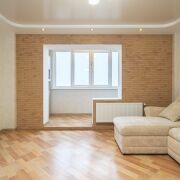 На полу, в жилых комнатах, кухне и коридоре уложен ламинат единым полотном, без разделения порогами.