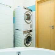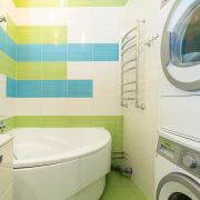 Санузел раздельный. Установлена большая угловая ванна, а также стиральная и сушильная машины. В туалете имеется емкий бойлер на период отключения горячей воды и смотнирован гигиенический душ. В обоих помещениях санузла уложен кафель современных европейских коллекций.