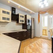 Большая, практически 13-ти метровая, кухня оборудована мебелью по индивидуальному заказу и техникой. Кухонный гарнитур изготовлен из массива. А надежные механизмы обеспечат долговечность эксплуатации. Встроенная техника: духовой шкаф, микроволновая печь, варочная панель с четырьмя конфорками, мощная вытяжка, холодильник, встроенная посудомоечная машина. А также, что не маловажно, установлена система очистки воды! В рабочей зоне уложен кафель.