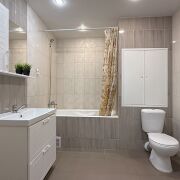 Большой совмещённый санузел облицован плиткой, установлен унитаз, металлическая ванна, напольная тумба с раковиной и зеркальный шкафчик.
