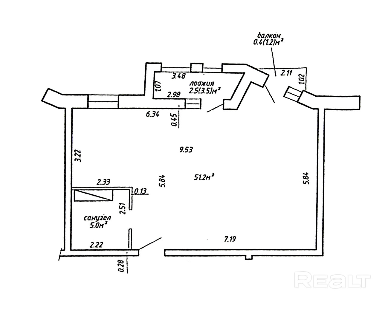 Общая площадь по СНБ 59,1кв.м. Общая площадь 56,2кв.м.