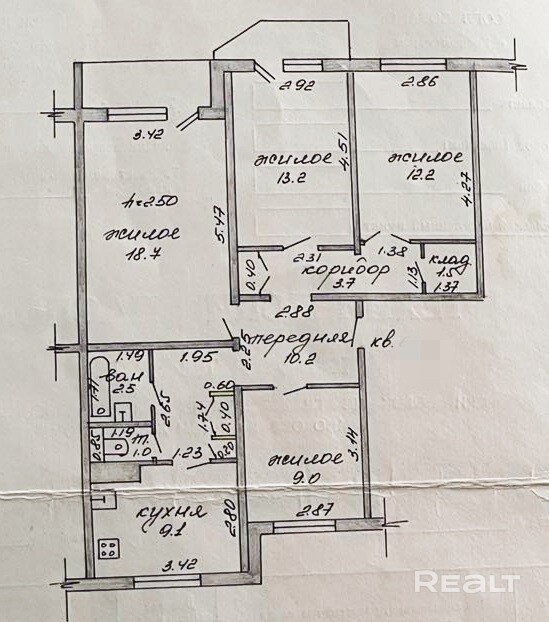 Удачная планировка: все 4 жилые комнаты изолированные. Общая площадь квартиры (с балконом и лоджией) 84,5 кв.м. Жилая площадь 53,1 кв.м. (Комнаты 18,7; 13,2; 12,2; 9,0 кв.м.) Площадь кухни 9,1 кв.м.