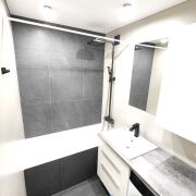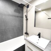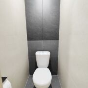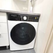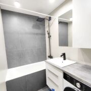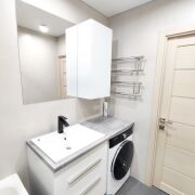 - Санузлы отделаны керамогранитом. В ванной комнате установлена мебель и стиральная машина Maunfeld.