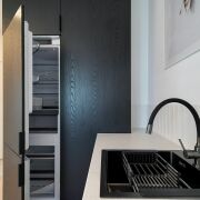 Просторная гостиная, объединенная с кухней, готова для встреч с друзьями и семейных вечеров. Функциональная часть кухни выполнена в актуальном стиле: без верхних шкафов, при этом имеет полуостров и большое количество мест хранения. Вся бытовая техника встроена: двухкамерный холодильник NoFrost, полноразмерная посудомоечная машина,духовой шкаф, индукционная варочная панель и потолочная вытяжка. Зона столовой представлена круглым столом и удобными стульями в мягкой обивке. В гостиной части квартиры имеется диван с полноценным спальным местом.