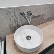 Ванная комната объединена с санузлом и обустроена полноценной ванной 180 см европейского производства, современной инсталляцией и смесителями. Предусмотрены места хранения в виде встроенных шкафов,а так же подвесная функциональная тумба со столешницей из натурального дуба с накладным умывальником.