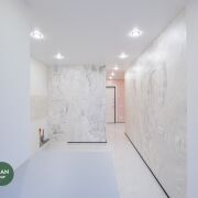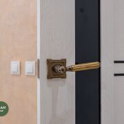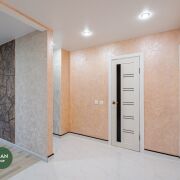 В комнате обои тёплых тонов с дизайнерской стеной для большого экрана.
