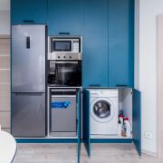 Встроенная кухонная мебель укомплектована бытовой техникой.