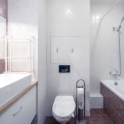 Ламинат, натяжные потолки, стильная плитка в санузле.