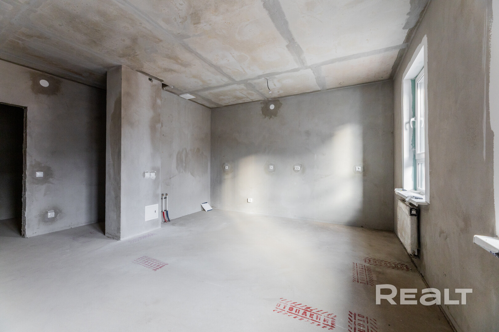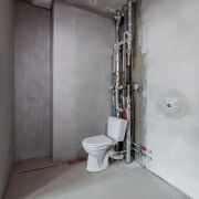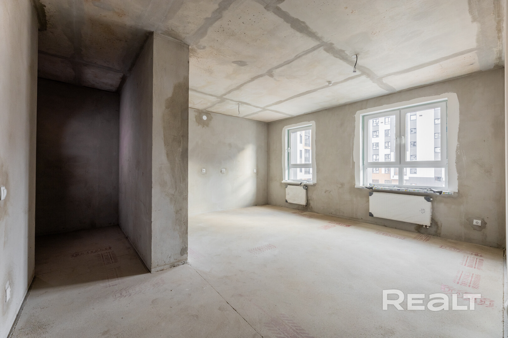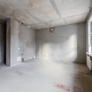 Квартира без чистовой отделки, при этом выполнена стяжка пола и штукатурка стен, установлены оконные блоки из ПВХ-профиля с заполнением двухкамерным стеклопакетом. Разведена электрика с установкой розеток и выключателей, подведено оптоволокно.