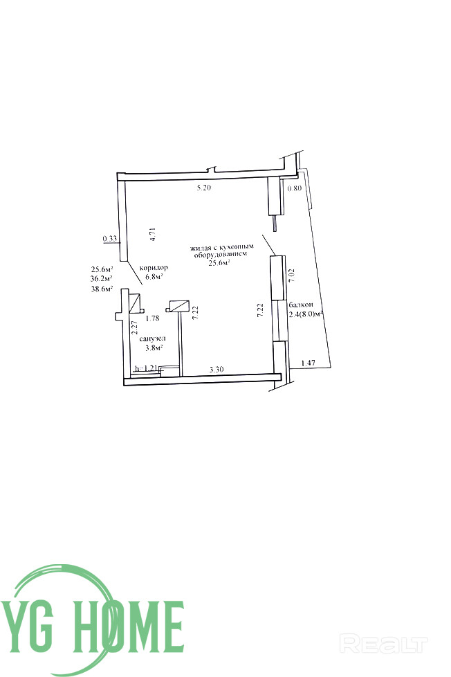 - Площадь квартиры СНБ – 38,6 м2, общая – 36,2 м2, жилая 25,6 м2.