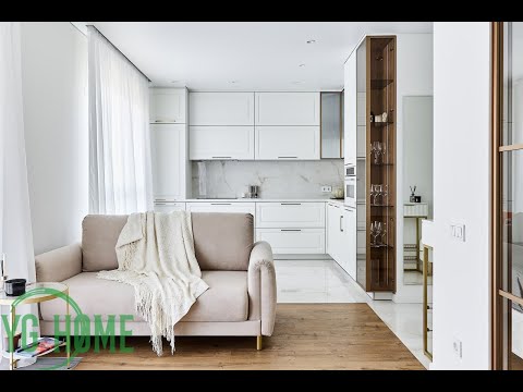 Грамотно сделана планировка квартиры с изолированным спальным местом, зоной кухни и гостиной зоной. Спальня зонирована стеклянной перегородкой с раздвижными дверями и шторами блэкаут.