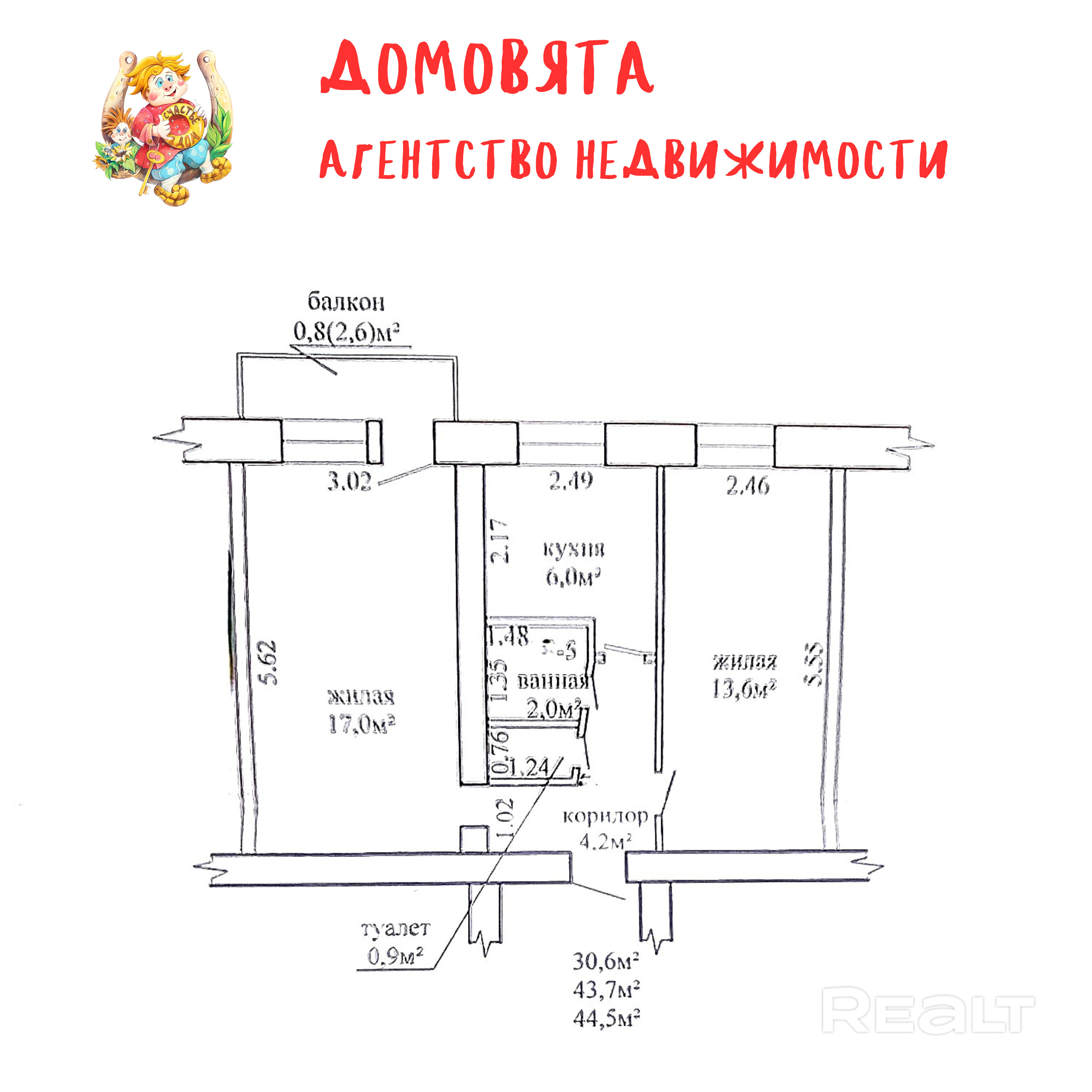 Прекрасная светлая, теплая квартира в спокойном и экологически чистом районе города Борисова "Печи". Адрес: Борисов, ул. Серебренникова, д. 14 - Общая площадь квартиры составляет 43,7 м2.