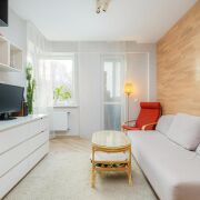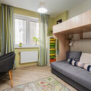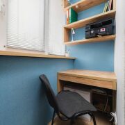 - Гостиная оформлена с использованием ламината 33 класса, декоративных обоев, камня и паркетной доски. Балкон обустроен под рабочий кабинет с тройными стеклопакетами и теплым полом. Окна выходят на живописный сквер. Для поддержания микроклимата установлен кондиционер.