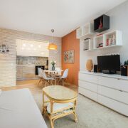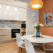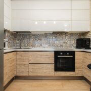 - В спальне на полу ламинат, стены оклеены обоями, а потолок выполнен из гипсокартона, что придает пространству завершенный вид. Кухня оснащена плиткой на полу, встроенной мебелью из высококачественных материалов и всей встроенной техникой, включая холодильник. Потолок также сделан из гипсокартона.