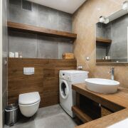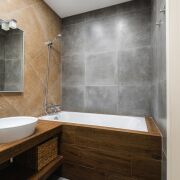 - Совмещенный санузел отделан плиткой, оснащен акриловой ванной, дорогой сантехникой и теплым полом. Бойлер и стиральная машина остаются.