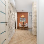 - Коридор с плиточным покрытием и декоративным камнем на стенах дополняет встроенный шкаф-купе и металлическая шумоизоляционная дверь, делая пространство функциональным.
