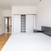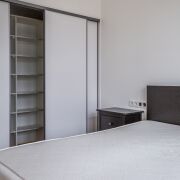 Спальня 18.75 м2 за двойной дверью, с двуспальной кроватью и ободурованной вместительной гардеробной, с открытыми полками и штангами.