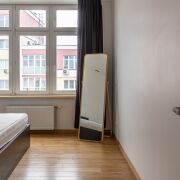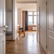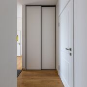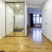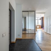 Из кухни-гостиной мы попадаем в просторную прихожую 13.2 м2, пол частично облицован плиткой, установлен встроенный зеркальный шкаф и шкаф-купе. Входная металлическая дверь, установлен видеодомофон.