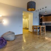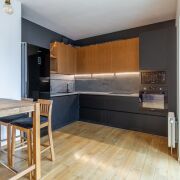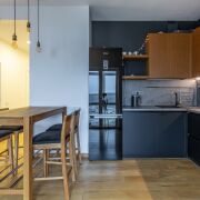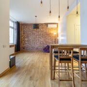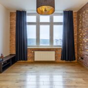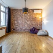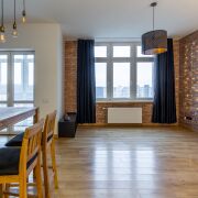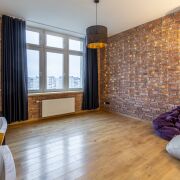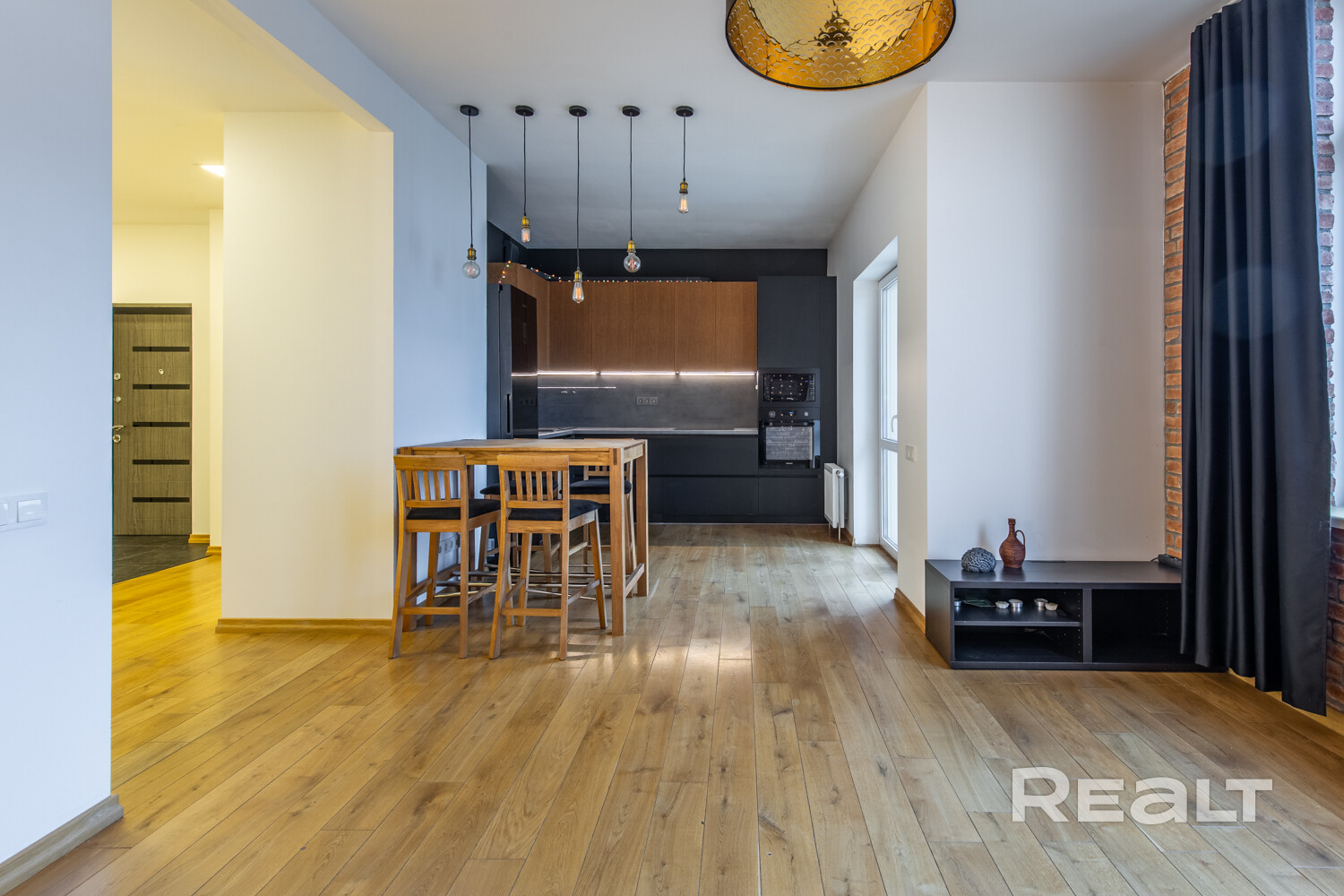 Кухня-гостиная 25.3 м2 со встроенной кухней и бытовой техникой: посудомоечная машина Bosch, духовой шкаф, встроенная свч-печь и холодильник samsung, фурнитура Вlum. Столовая группа из массива с полубарными стульями. Акцентные стены в зоне гостиной декорированы красным кирпичом, установлен кондиционер. Выход на застекленную лоджию с видом на лес!