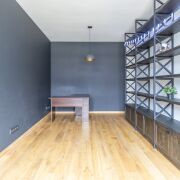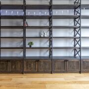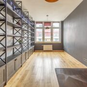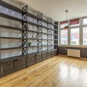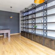 Комната 19.24 м2 со стеллажами из массива и рабочим столом.