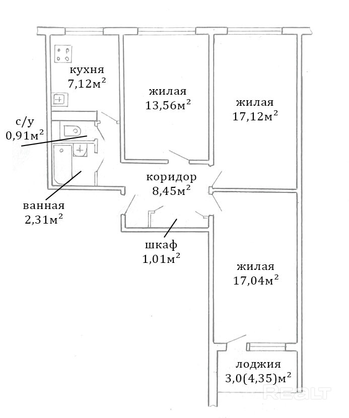 Удобная планировка: Все комнаты (13.56, 17.12 и 17.04 м2) изолированы и просторны, идеальны для комфортного проживания большой семьи.