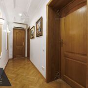 Вся мебель изготовлена по индивидуальному заказу из березы, гармонично вписывается в общий стиль интерьера и дополнена стильными элементами декора, создающими атмосферу уюта для отдыха и встреч с гостями. Натуральный паркет и деревянные дверные блоки подчеркивают качество отделки. В кухне, санузле и ванной использована испанская плитка.