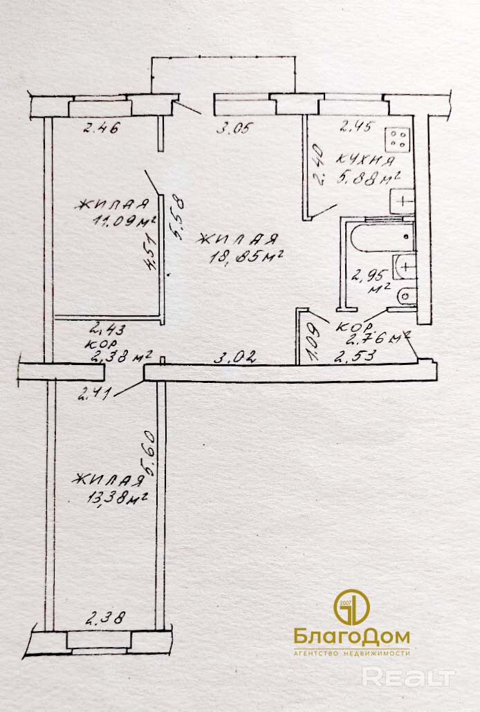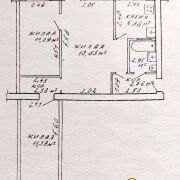 Общая площадь квартиры 57.3 м2, жилая площадь 43.3 м2 , площадь кухни 5.9 м2.
