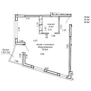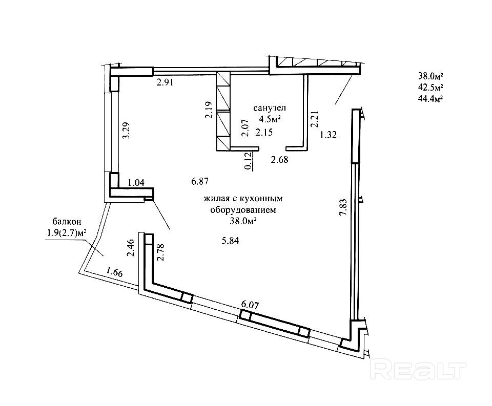 Общая площадь по СНБ 44,4 кв.м. Общая площадь 42,5 кв.м. Высота потолка 2,71 м.