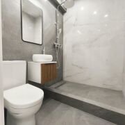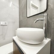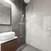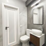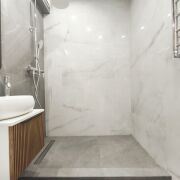 · Стильный совмещённый санузел, полностью облицованный итальянской плиткой. Эстетика и практичность в каждой детали.