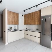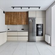 - Кухня укомплектована всей необходимой бытовой техникой: холодильником, духовым шкафом, микроволновой печью, посудомоечной машиной и варочной панелью.