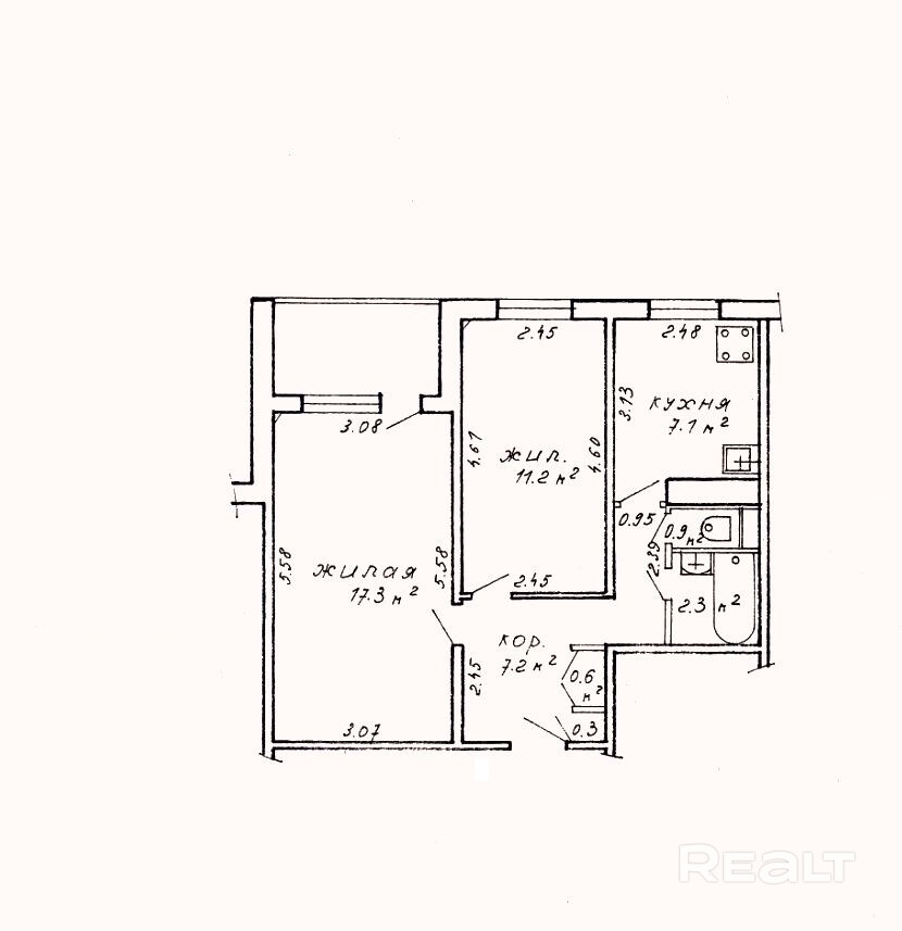 Общая площадь по СНБ - 49м2, жилая - 28.5м2, кухня – 7.1м2.