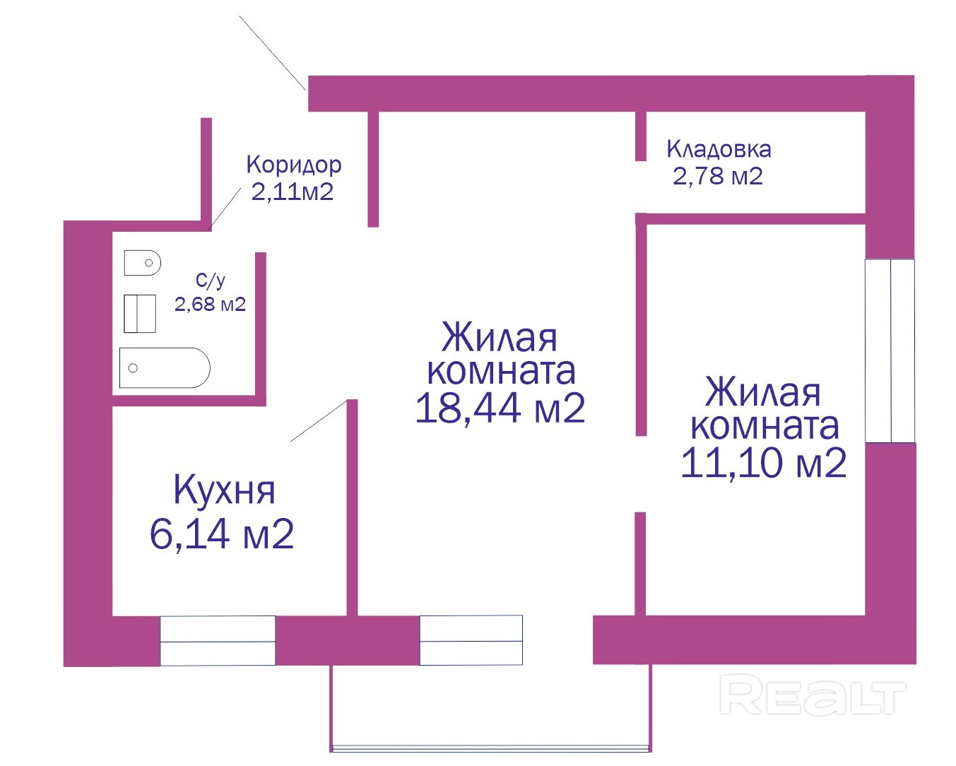 Общая площадь 44 м2, жилая 29.5 м2, кухня 6 м2.