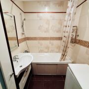 Ванна и санузел облицованы плиткой. В санузле есть дополнительный умывальник со шкафчиком.
