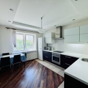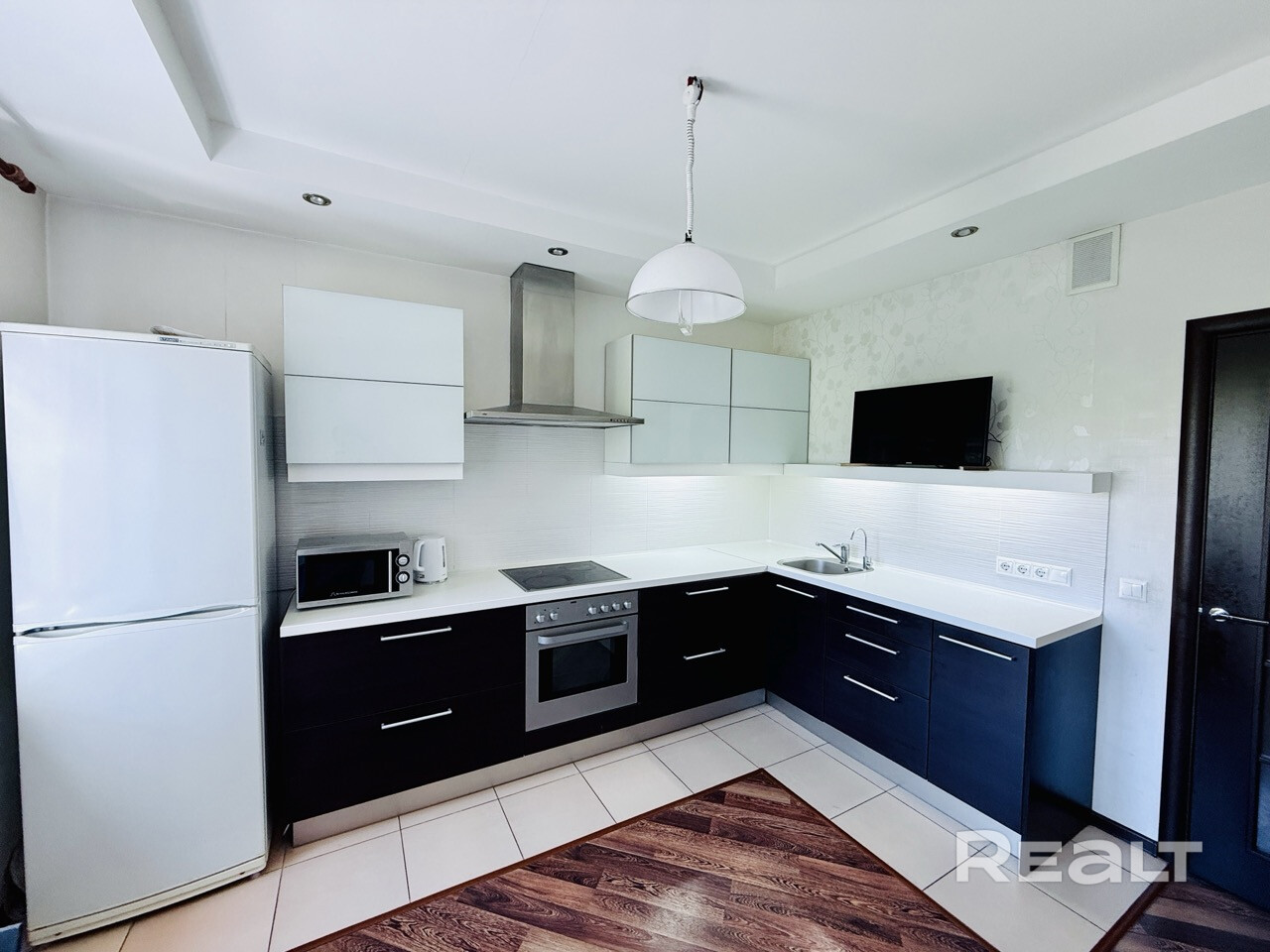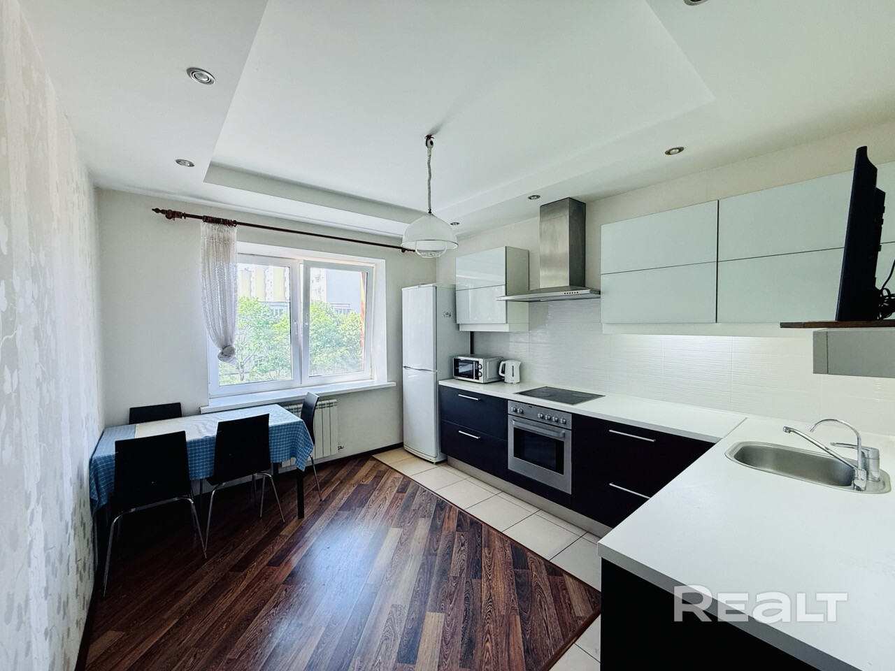 Встроенная кухня с бытовой техникой.Много мест для хранения всего необходимого. Установлен фильтр для очистки воды. Дополнительное освещение зоны приготовления еды. Потолки многоуровневые. На полу плитка и ламинат.