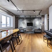 Интерьер выполнен в современном стиле с элементами лофта: натуральное дерево, фактурные материалы, сценарное освещение. В отделке использованы качественные и долговечные материалы, квартира выглядит актуально и дорого.