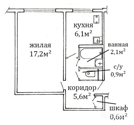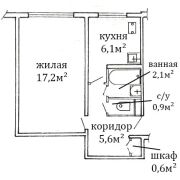 Общая площадь: 32,2 м2 , включает жилую зону 17,4 м2 и кухню 6,1 м2.